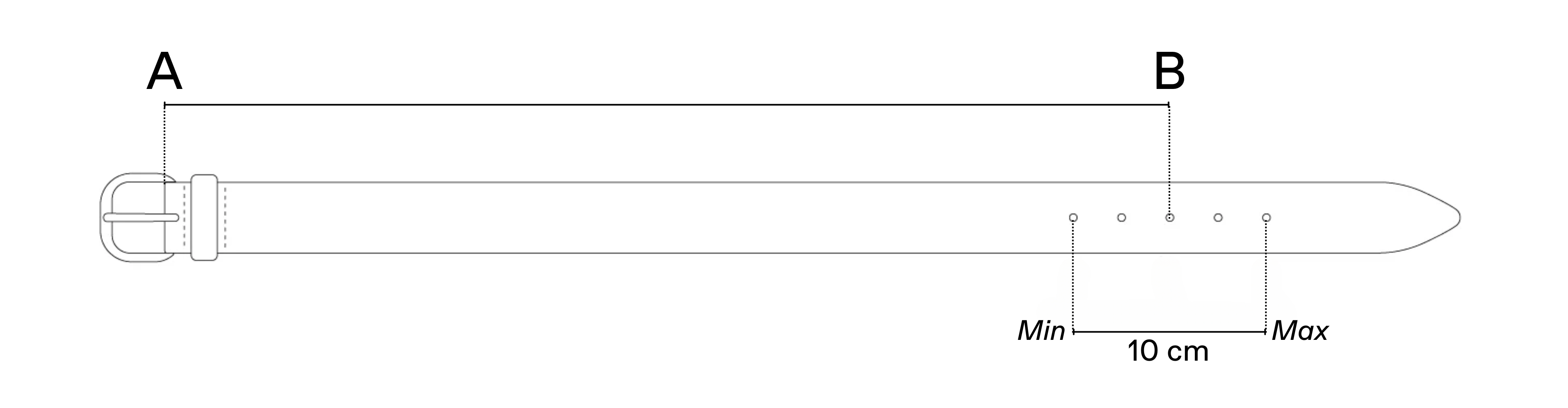At Mom’s Goods, sizes are measured from the base of the buckle (Point A) to the middle hole (Point B).